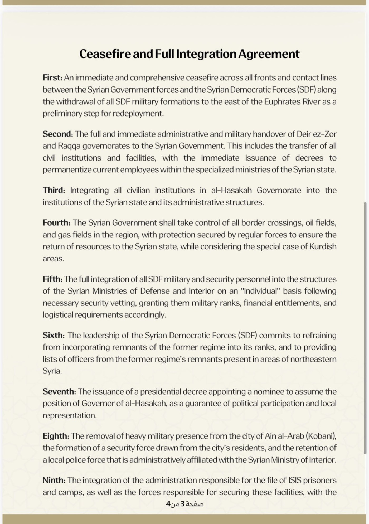 The agreement sees the peaceful handover of military and civilian institutions in Deir ez-Zor and Raqqa to the Syrian government, and the integration of Hasaka's civilian institutions into the Syrian state, among a wide range of other points. Below is a translated version of the document, as released by the Syrian information minister Hamza al-Mustafa on X.